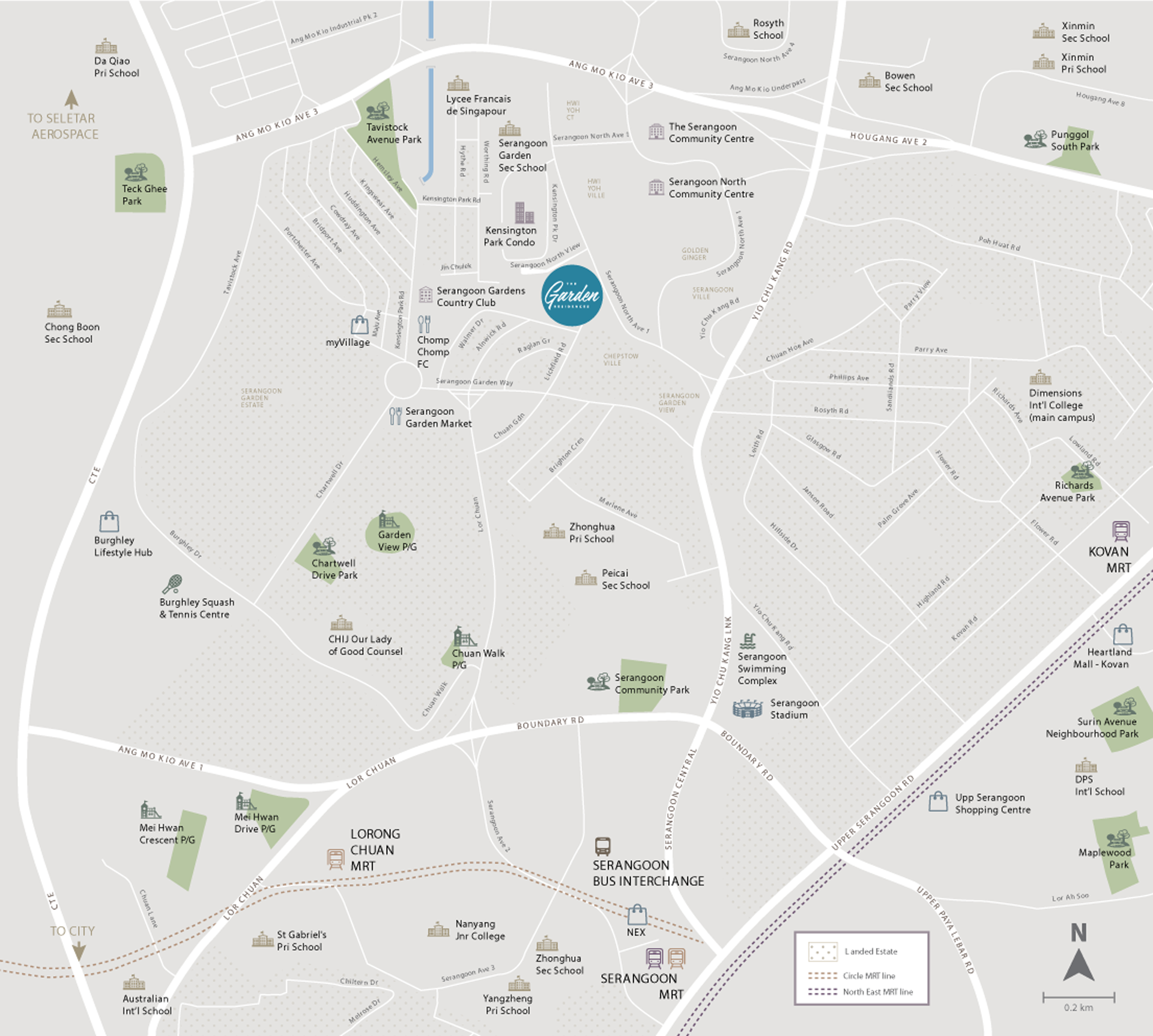 The Garden Residences is nestled within lush gardens, surrounded by a private landed house enclave within the established neighbourhood of Serangoon Gardens and the residential developments of Serangoon North. With its rich history, Serangoon Gardens is one of the oldest estates in Singapore. With a wide range of F&B choices including cafes, restaurants, the famous Chomp Chomp food centre and Serangoon Garden Market, along with shops and supermarkets within the nearby myVillage Shopping Mall, The Garden Residences benefits greatly from the convenience and access to these daily necessities.